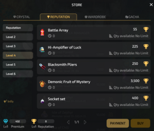 Example: If your Reputation Shop level is 4, you can use levels 1, 2, 3, and 4 respectively.