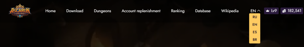 - Para cambiar el idioma, debes iniciar sesión en el sitio web con tu cuenta del juego, hacer clic en la bandera en la esquina superior derecha del sitio, seleccionar un idioma y luego volver a entrar al juego con tu personaje.